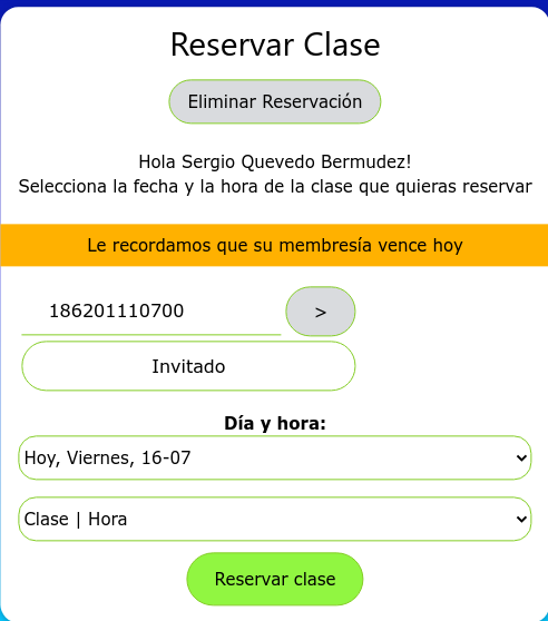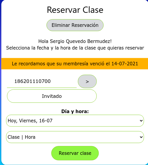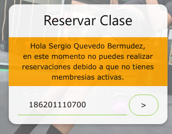 Cuando el cliente tiene su membresía vencida e intenta reservar, el sistema no permitirá la reserva y le aparecerá el siguiente mensaje.