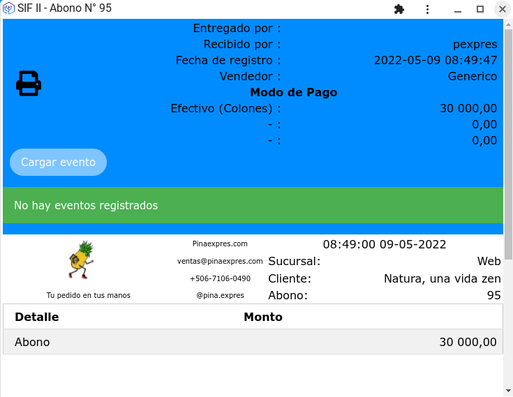 Ahora el sistema despliega un comprobante de abono permitiendo emitir un comprobante físico o dígital del abono registrado. Se despliega el comprobante al hacer click sobre el número de abono.